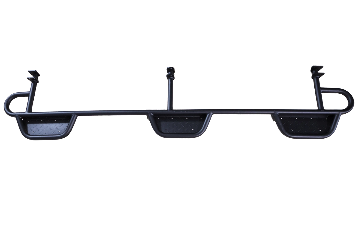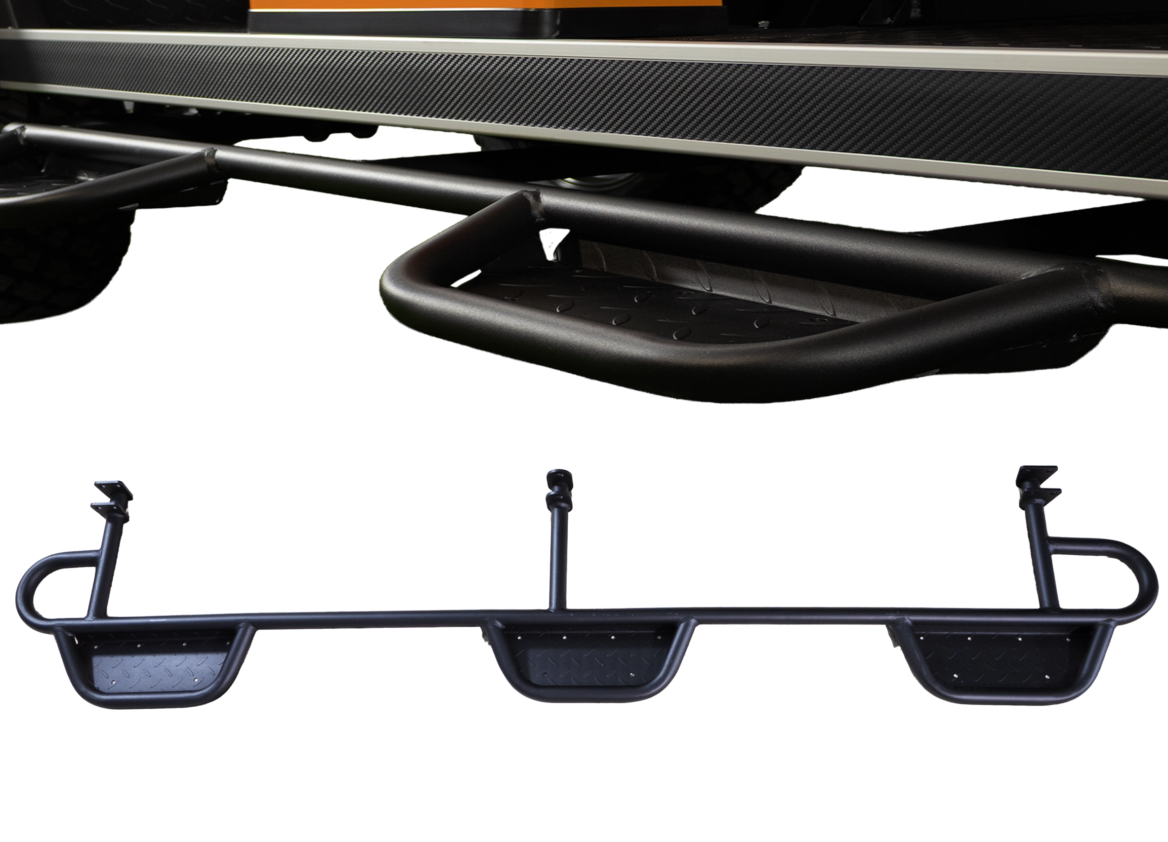 Upgrade your Whisper FF6 with durable, stylish metal step bars designed for easier access and a more refined look. This set includes two sets of step bars – one for each side of the cart – each featuring three steps to conveniently accomodate all rows of seating. Crafted for strength and stability, these step bars provide secure footing for passengers getting in and out, while enhancing the overall appearance with a sleek black finish. Built to seamlessly integrate with any Whisper FF6 model, this upgrade combines functionality and style for a more comfortable riding experience.