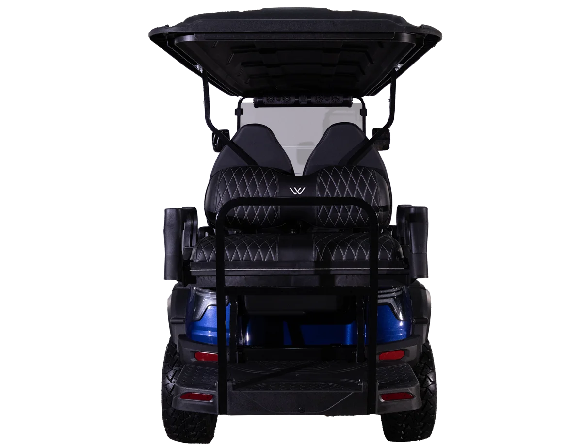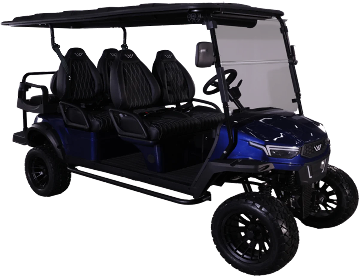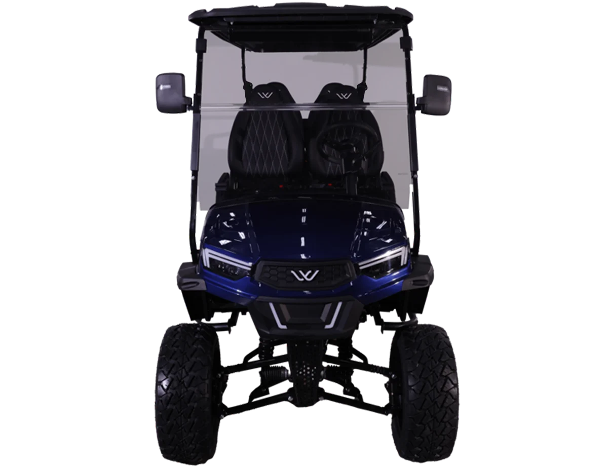 The Halo XL is Whisper’s luxury, all-electric golf cart, combining advanced features with exceptional comfort. It comes standard with an extreme-range lithium battery, ensuring extended use between charges. The Halo XL is equipped with a powerful overhead soundbar with a 6.5-speaker kit underneath the dash, undercarriage LED lights, and an upgraded floor mat for improved comfort. Additional features include a 110V power outlet, USB and USB-C charging ports, step bars, a wireless phone charger, and steering wheel audio controls.