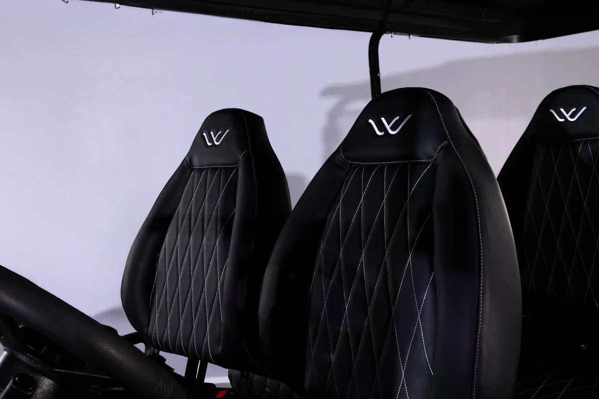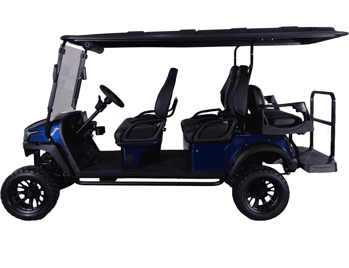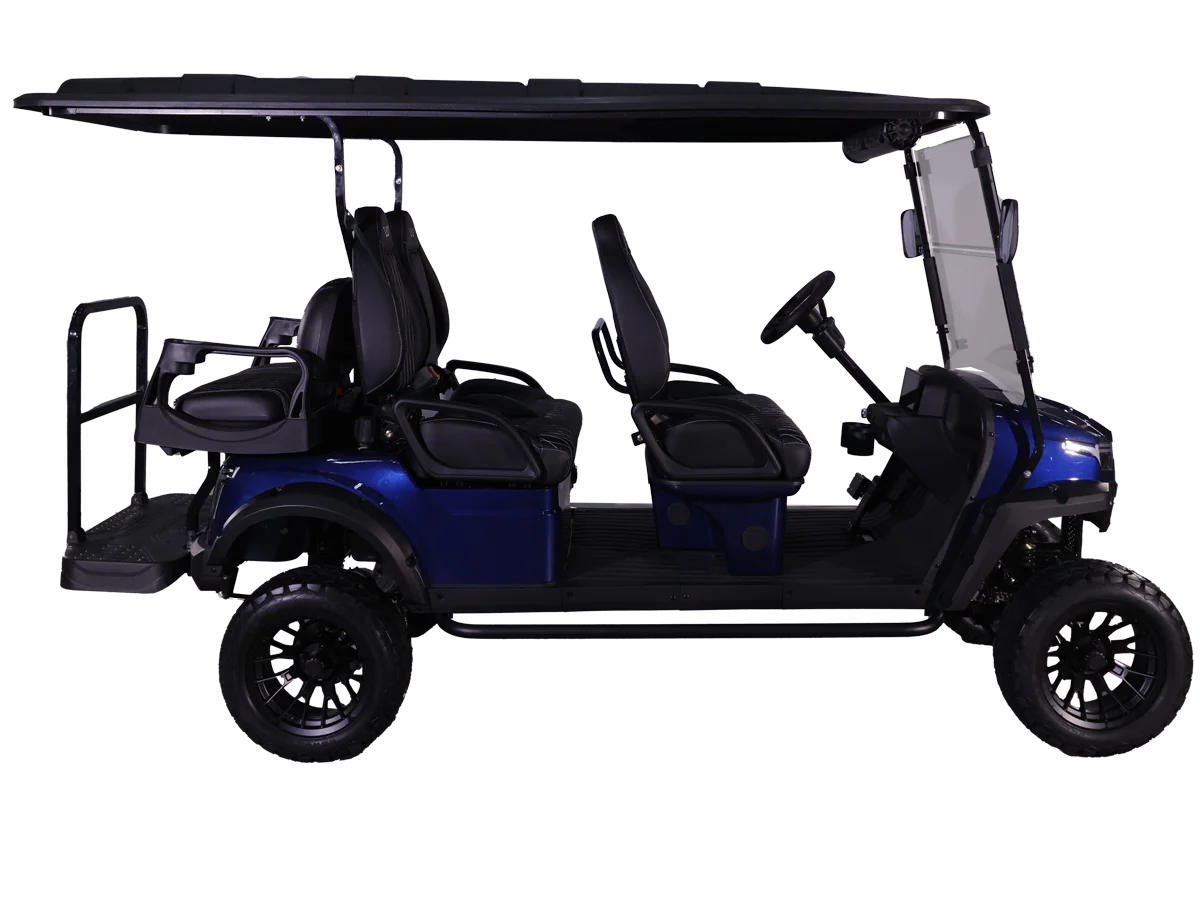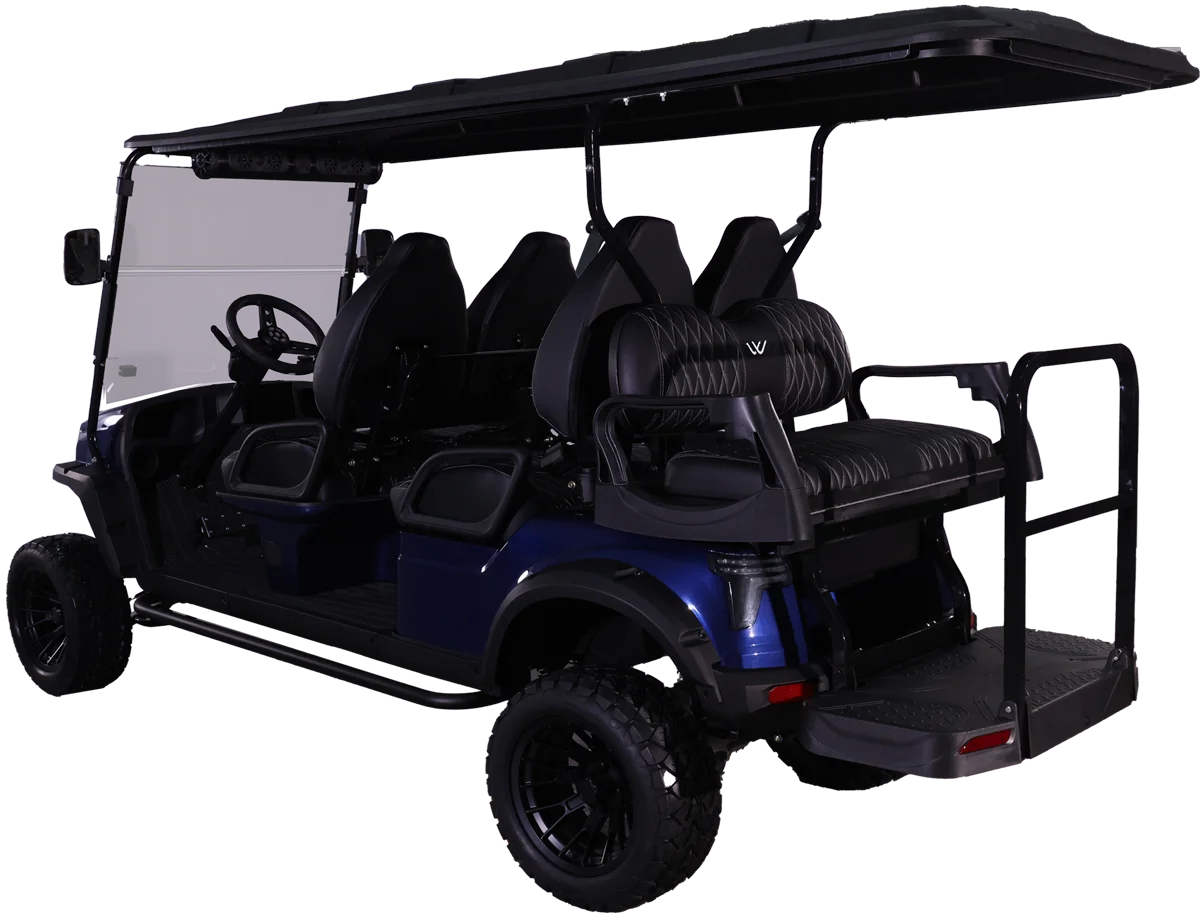 The Halo XL is Whisper’s luxury, all-electric golf cart, combining advanced features with exceptional comfort. It comes standard with an extreme-range lithium battery, ensuring extended use between charges. The Halo XL is equipped with a powerful overhead soundbar with a 6.5-speaker kit underneath the dash, undercarriage LED lights, and an upgraded floor mat for improved comfort. Additional features include a 110V power outlet, USB and USB-C charging ports, step bars, a wireless phone charger, and steering wheel audio controls.