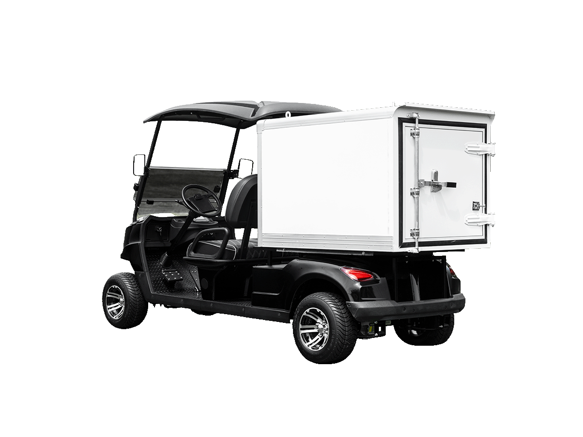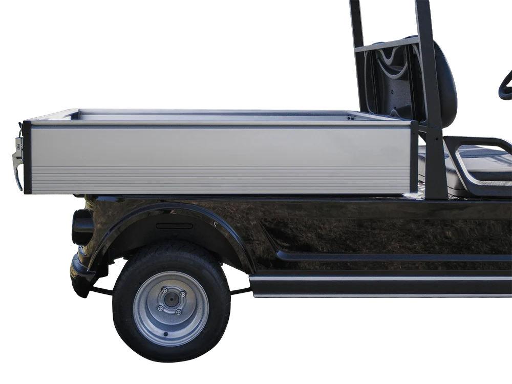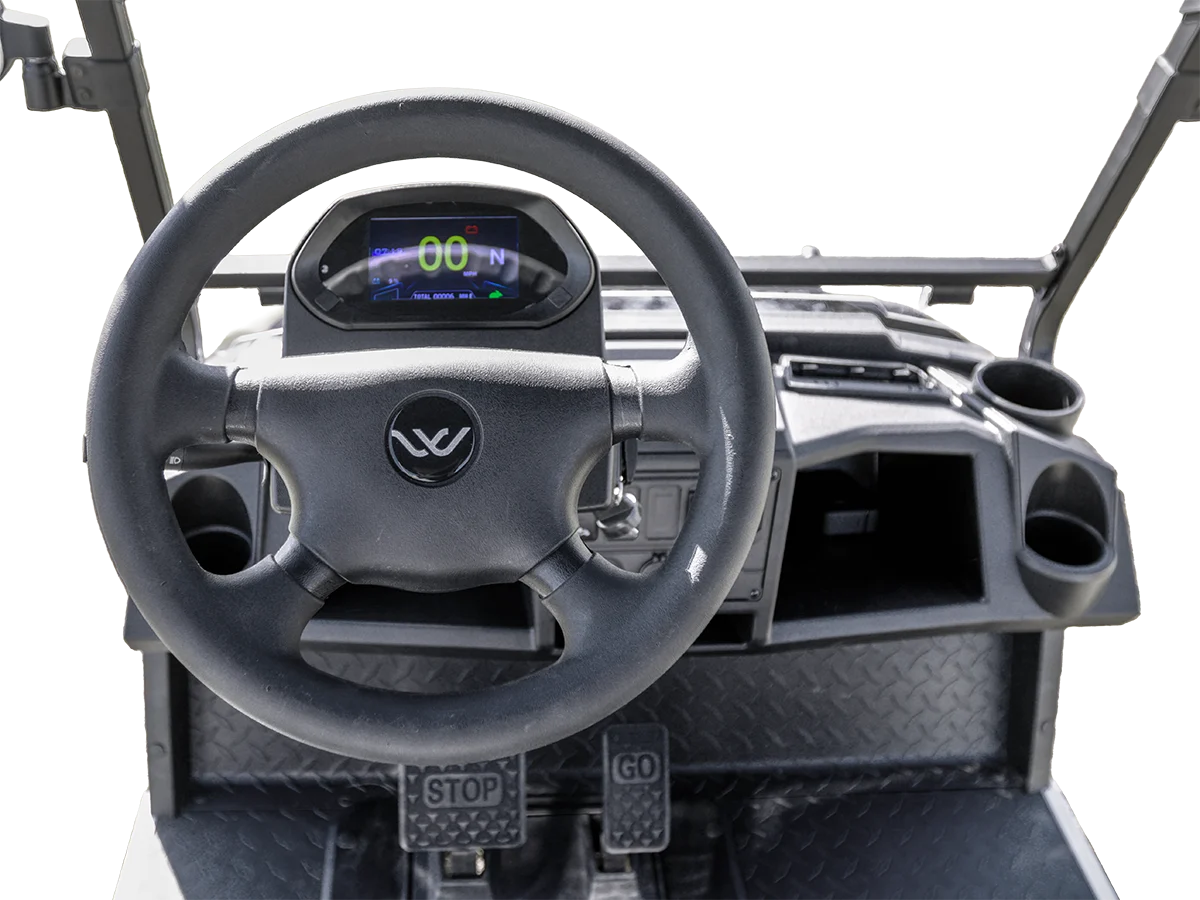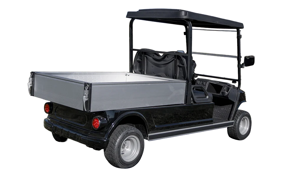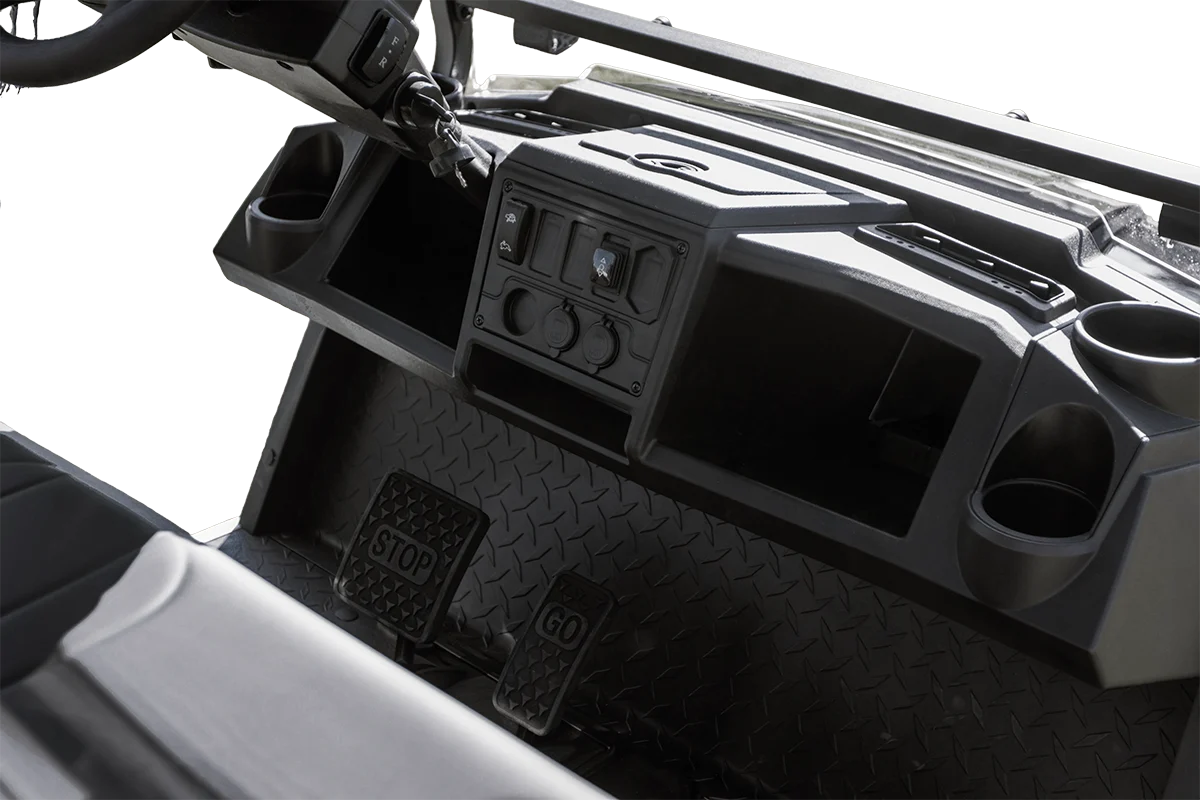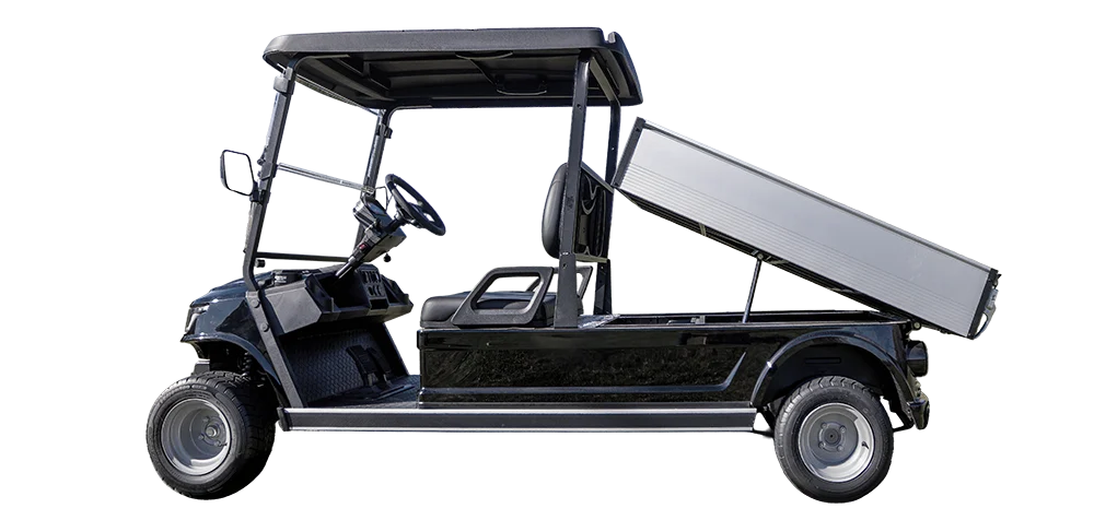 The Utility Cart is an all-electric vehicle designed for durability, power, and efficiency, making it ideal for various tasks and terrains. It features a powerful design with custom front seating, fold-down windshield, independent front suspension, and an automatic hydraulic dump bed. The Utility Cart is also equipped with a speedometer, a USB charging port, and a digital display, ensuring connectivity and convenience. The Utility Cart’s chassis provides ample ground clearance, while providing a smooth and capable ride. An onboard charger simplifies maintenance, keeping the Utility Cart ready for use, while the LED headlights provide a clear field of view. Whether for work or play, the Utility Cart is a reliable choice, showcasing versatility and performance.
