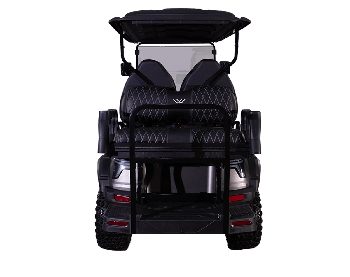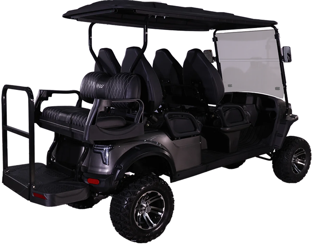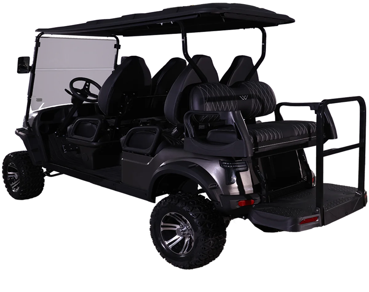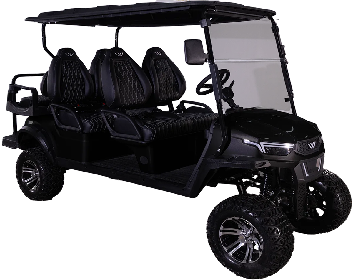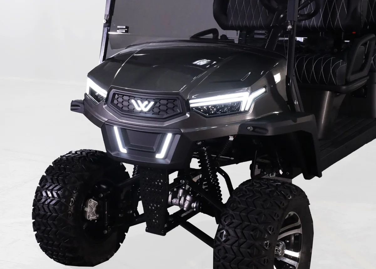 The six-seater W5 XL golf cart is an electric vehicle that combines style, performance, and practicality. The W5 XL features 12″ aluminum wheels and boasts a sleek design complemented by 7-color undercarriage LED lighting. The standard lithium battery showcases the fullest potential of the motor. Safety features include LED headlights, taillights, turn signals, and stop lights, ensuring visibility in various conditions. Its black interior, composed of premium marine-grade vinyl and custom white stitching, blends next-level comfort and refinement.