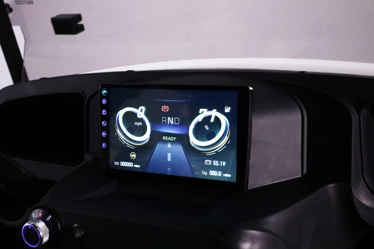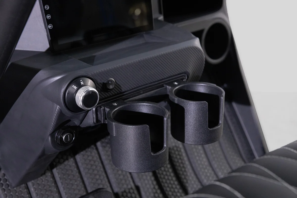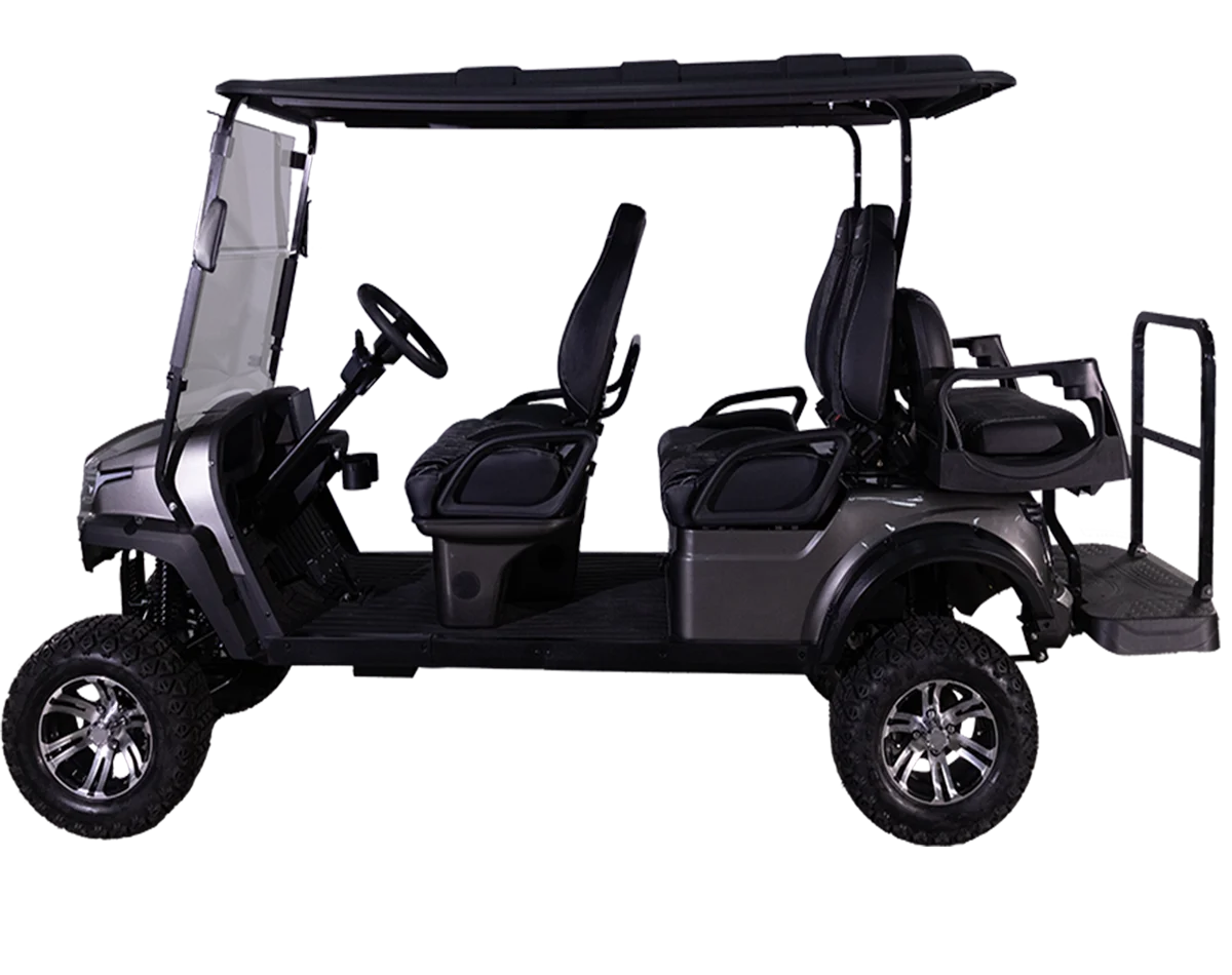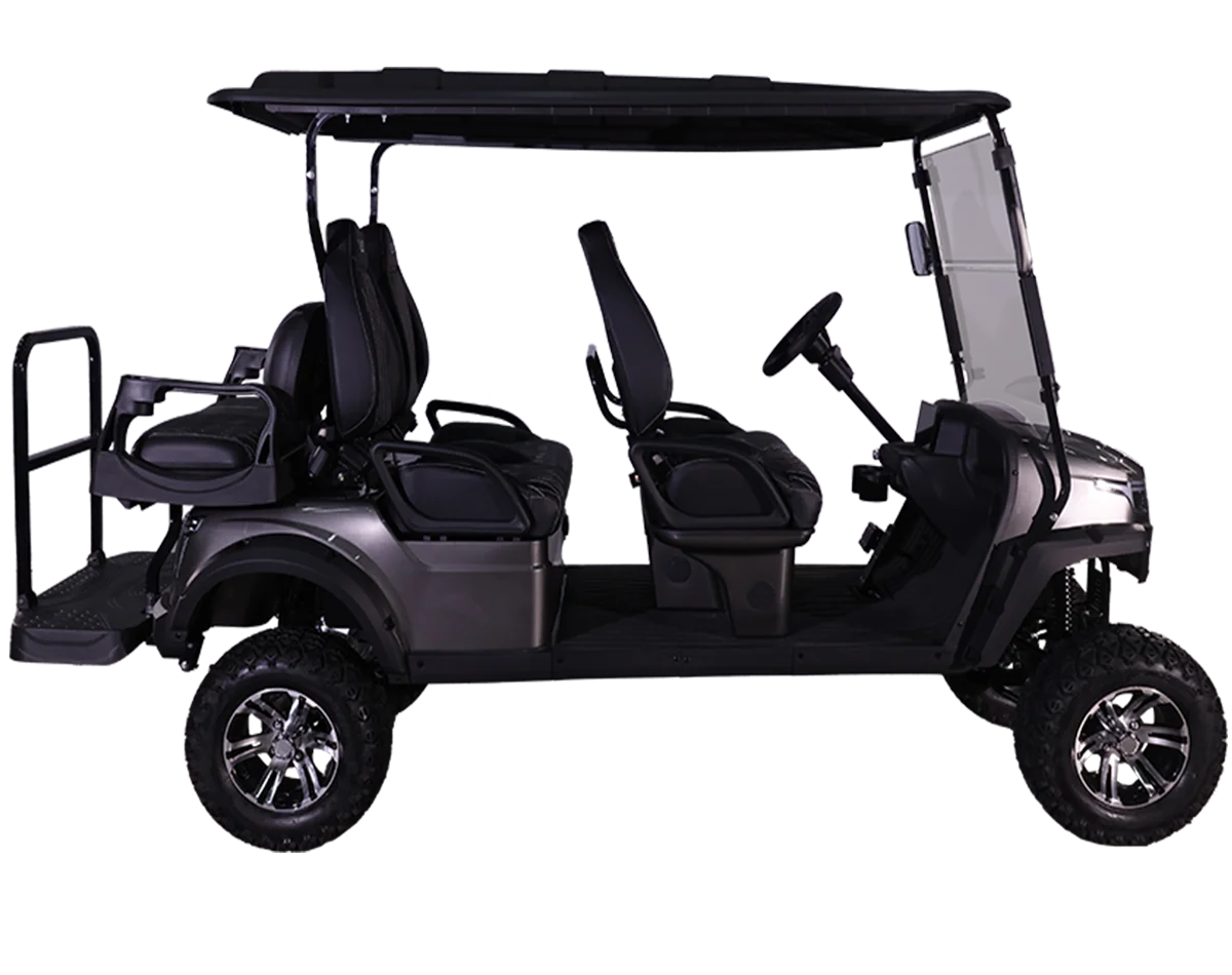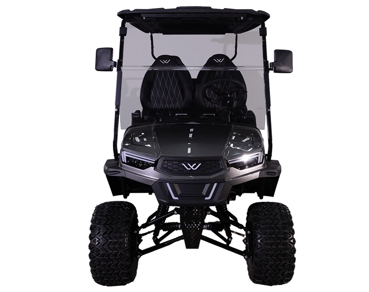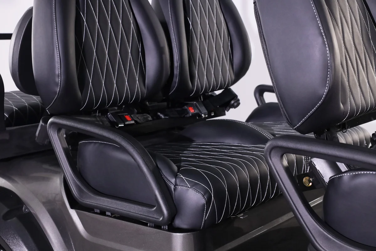 The six-seater W5 XL golf cart is an electric vehicle that combines style, performance, and practicality. The W5 XL features 12″ aluminum wheels and boasts a sleek design complemented by 7-color undercarriage LED lighting. The standard lithium battery showcases the fullest potential of the motor. Safety features include LED headlights, taillights, turn signals, and stop lights, ensuring visibility in various conditions. Its black interior, composed of premium marine-grade vinyl and custom white stitching, blends next-level comfort and refinement.