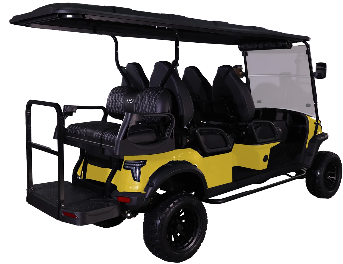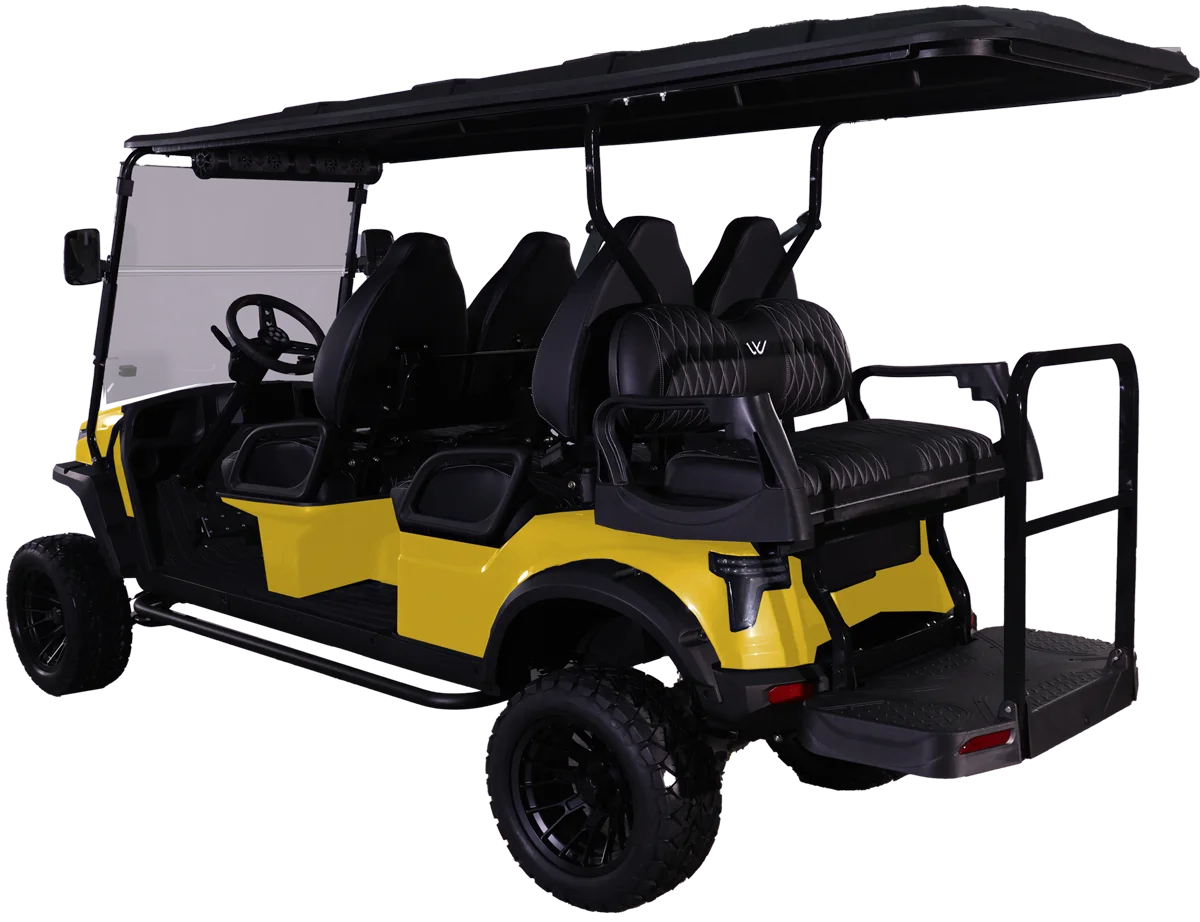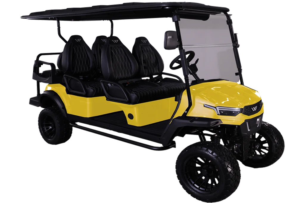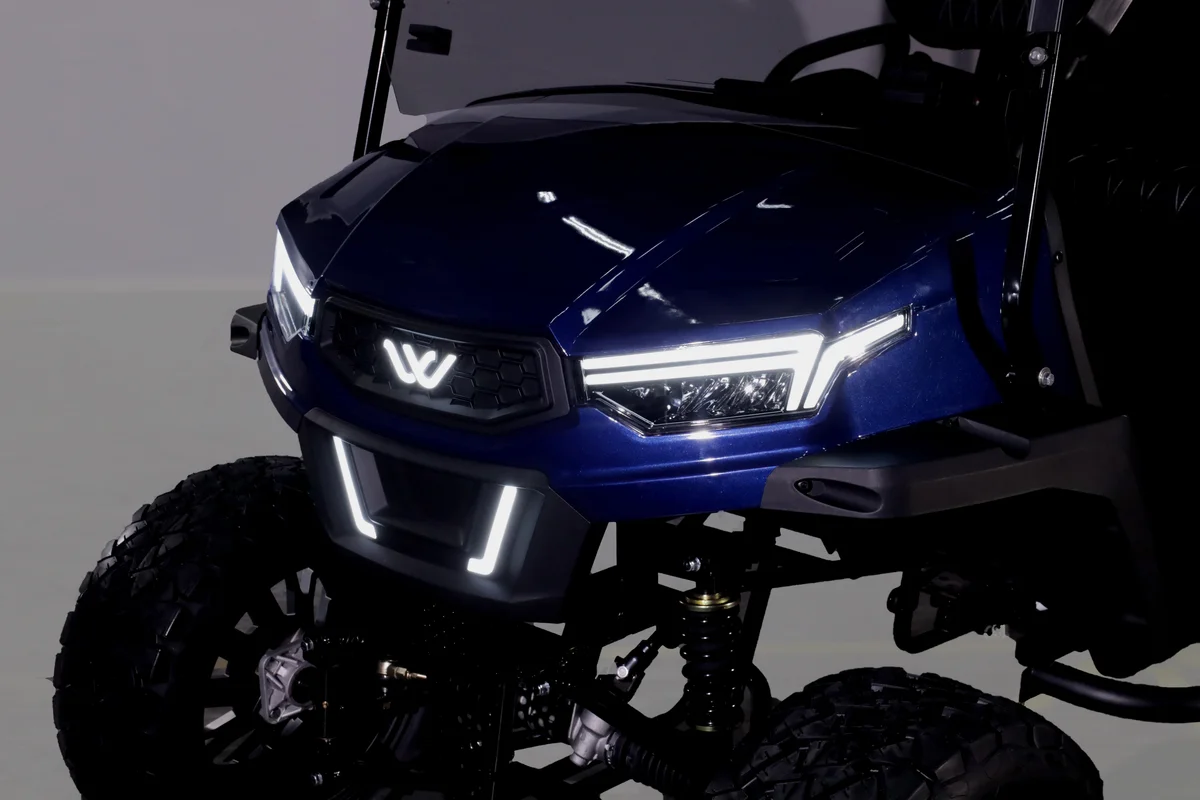 The W7 XL golf cart is a six-passenger electric vehicle that combines style, performance, and comfort. The W7 XL offers a vibrant and customizable ambiance, featuring a sleek exterior with 7-color LED lights that illuminate both the cabin and undercarriage. The cart is equipped with a 9″ LCD touchscreen and a powerful overhead soundbar, allowing for a vibrant listening experience. A built-in speedometer, USB charging port, and 12V accessory plug add to its modern conveniences while the marine-grade vinyl interior blends durability and comfort.