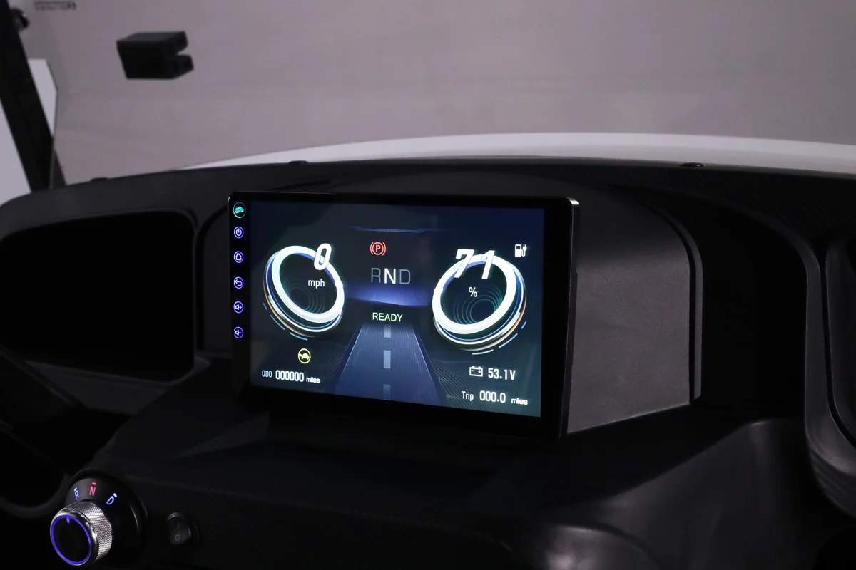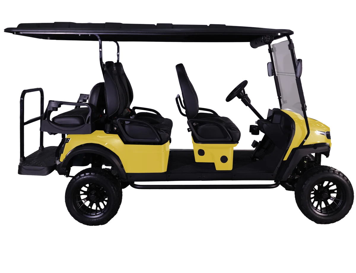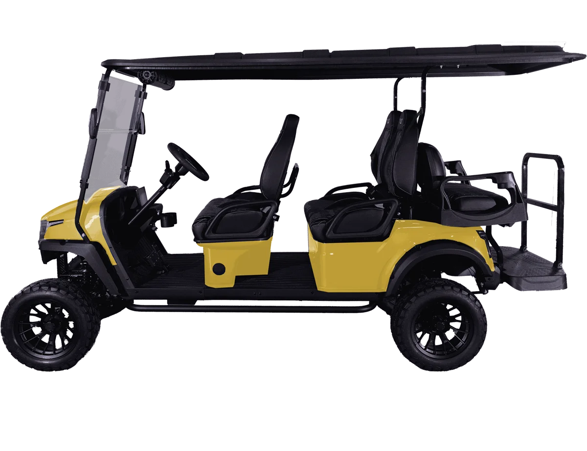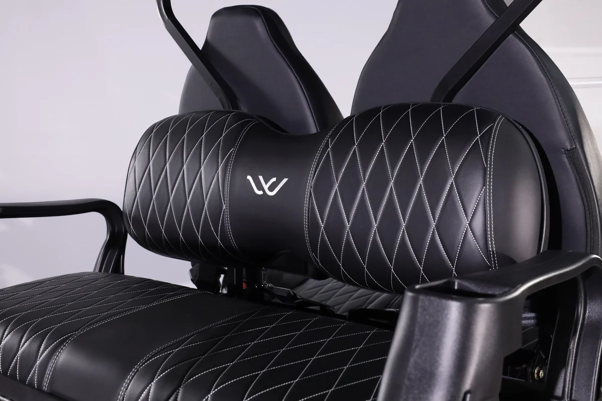 The W7 XL golf cart is a six-passenger electric vehicle that combines style, performance, and comfort. The W7 XL offers a vibrant and customizable ambiance, featuring a sleek exterior with 7-color LED lights that illuminate both the cabin and undercarriage. The cart is equipped with a 9″ LCD touchscreen and a powerful overhead soundbar, allowing for a vibrant listening experience. A built-in speedometer, USB charging port, and 12V accessory plug add to its modern conveniences while the marine-grade vinyl interior blends durability and comfort.